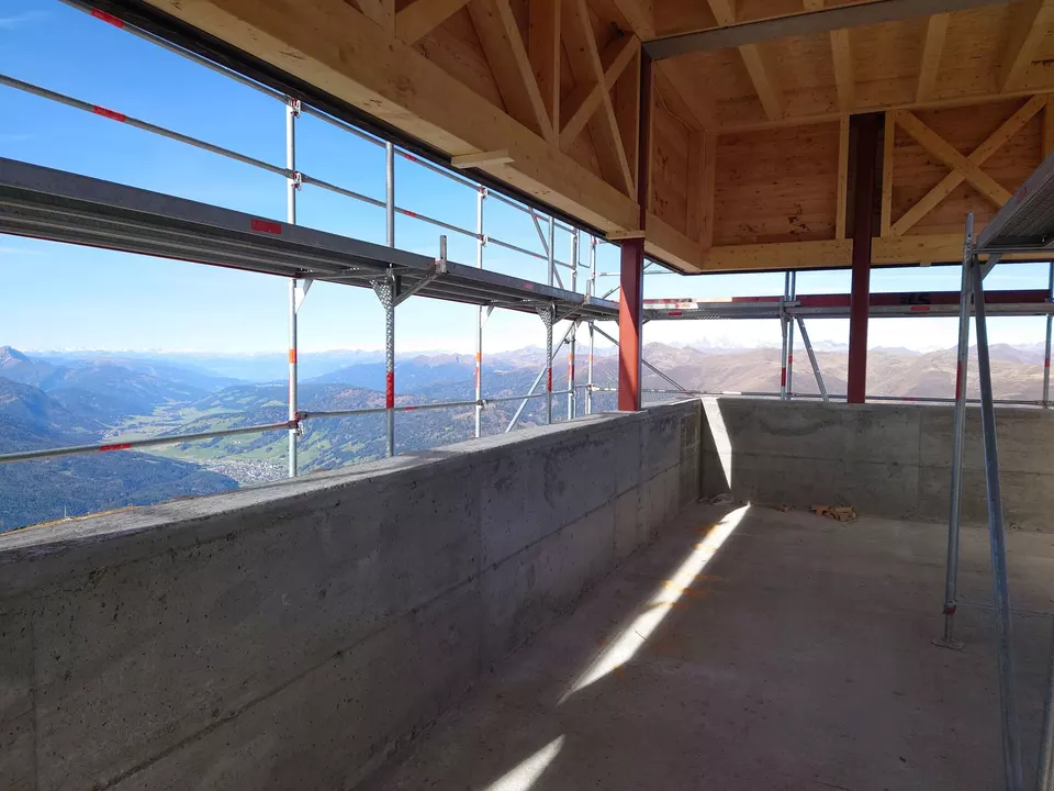 Auf historischen Fotos ist zu sehen, dass es bereits auf der ursprünglichen Dachkonstruktion zeitweise einen Holzaufbau gab. Nun hat Projektant und Bauleiter Architekt Johannes Watschinger diese Plattform neu gedacht. Sie gibt den Blick auf 360 Grad Bergwelt frei. Im Zuge der Arbeiten hat sich herausgestellt, dass das Mauerwerk in schlechterem Zustand war als angenommen; deshalb wurden statische Verstärkungsmaßnahmen nötig, welche auch Mehrkosten verursachten.