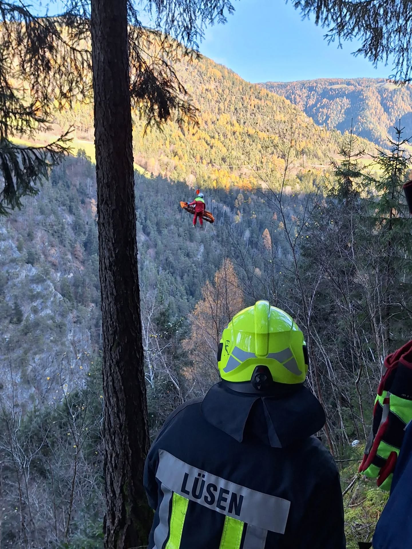 Zunächst traf der Notarzthubschrauber Pelikan 2 ein und brachte den Notarzt zur Einsatzstelle. Gemeinsam mit den First Respondern Lüsen wurde die verletzte Person – es handelt sich um einen rund 40-jährigen einheimischen Mann – medizinisch erstversorgt.
