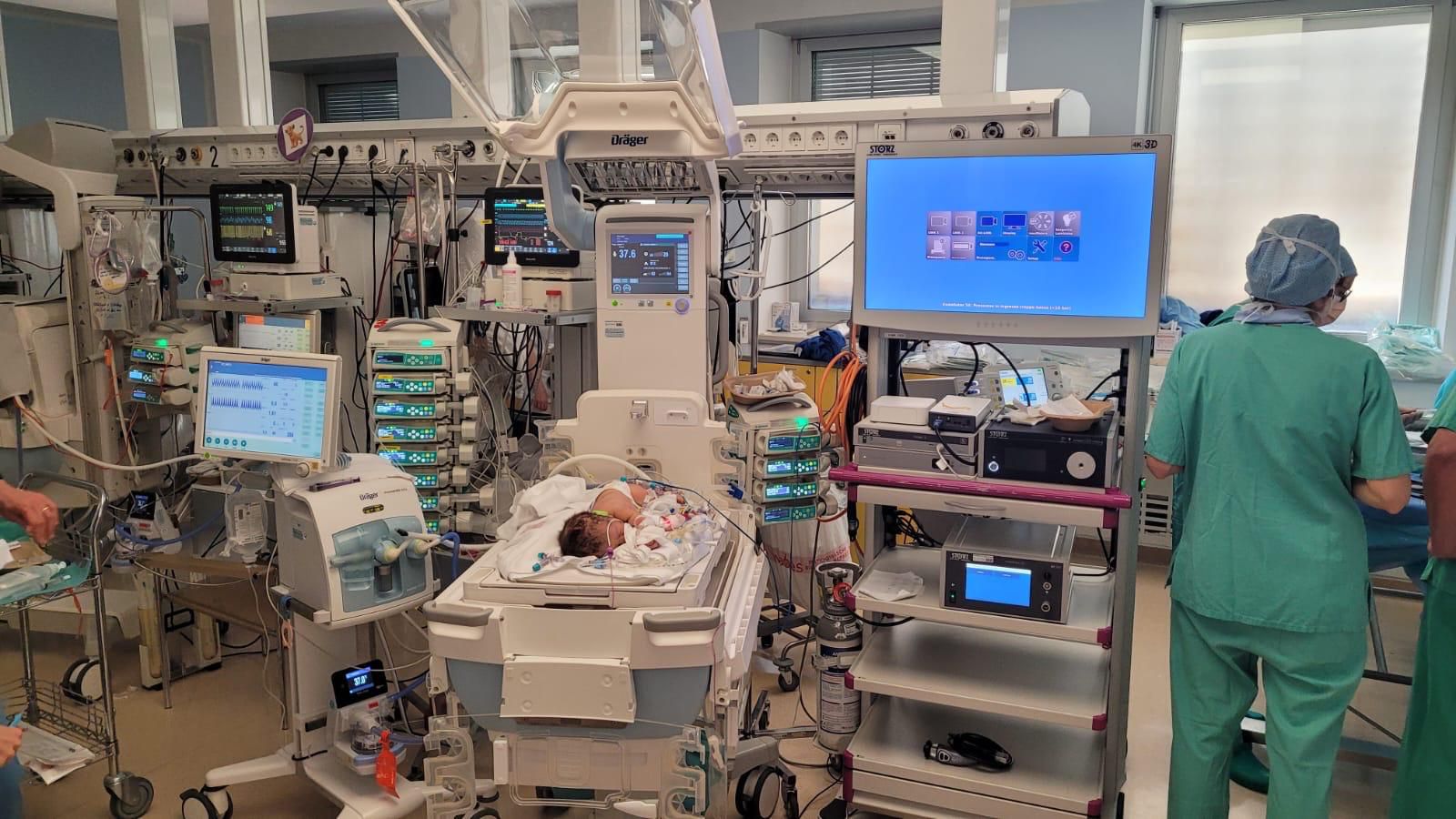 Der Eingriff erfolgte thorakoskopisch, also minimal-invasiv durch unvorstellbar kleine Schnitte von nur drei Millimetern in den Brustkorb. „Es ist wichtig, dass die Lücke so bald wie möglich verschlossen wird, die Organe müssen an die richtige Stelle verlagert werden“, erläutert Dr. Michele Corroppolo. „Das Besondere an diesem Eingriff war auch, dass er direkt auf der Neugeborenen-Intensivstation durchgeführt wurde. Dies erforderte ein konzentriertes Zusammenspiel von Neonatologen und dem gesamten OP-Team. Besonderer Dank ergeht an die Kinderanästhesisten unter der Leitung von Dr. Egon Glöggl und an das beteiligte Pflegepersonal.“