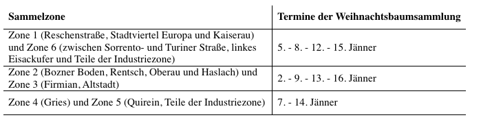 Außerdem können ausgediente Weihnachtsbäume montags bis samstags, von 8.00 Uhr bis 12.00 Uhr kostenlos bei der Sammelstelle für Gartenabfälle in der Voltastraße abgegeben werden. Die Sammelstelle öffnet am 7. Jänner 2026 wieder.