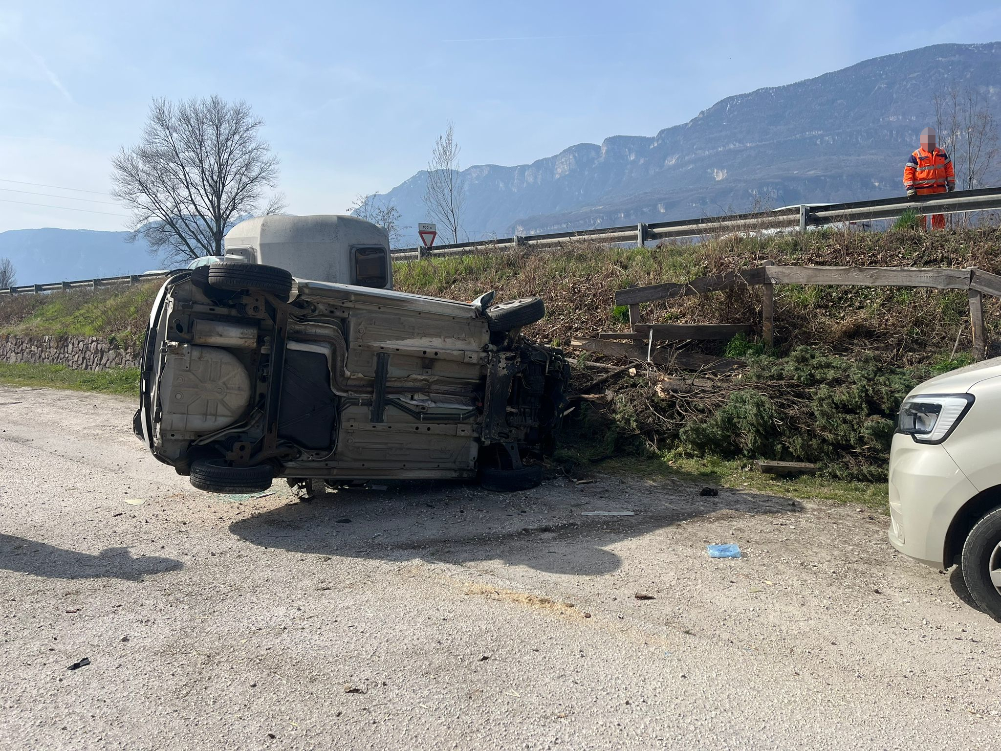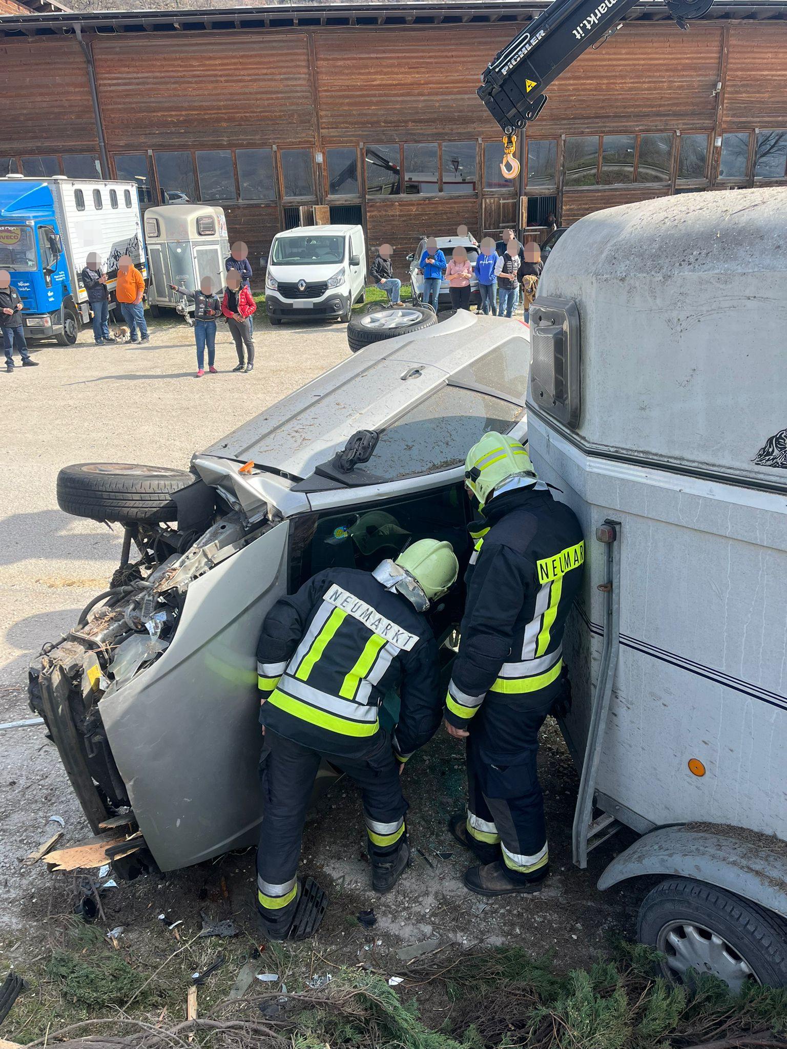 Auf der Brennerstaatsstraße, auf Höhe der Nordeinfahrt von Neumarkt, kam ein Pkw aus bislang ungeklärter Ursache von der Fahrbahn ab. Das Fahrzeug stürzte auf den tiefergelegenen Parkplatz des Reitstalls „Alps Coliseum“ und blieb in Schräglage auf der Deichsel eines dort abgestellten Pferdeanhängers liegen.