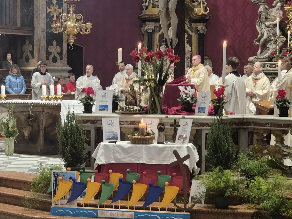 Auch der Gabengang griff das Leitwort „Pilger der Hoffnung“ in besonderer Weise auf. Neben Brot und Wein wurden mehrere symbolische Gaben zum Altar gebracht: ein Stein, der für Lasten, Scheitern und zugleich für Neubeginn stand; ein Pilgerstab als Zeichen des gemeinsamen Unterwegsseins und der Bereitschaft, Verantwortung zu übernehmen; sowie die Jubiläumsfigur „Luce“, die für das Licht der Hoffnung in Zeiten von Unsicherheit und Krise steht. Darüber hinaus wurde eine symbolische Spende für das Caritas-Projekt „Haus der Hoffnung“ dargebracht – als konkreter Ausdruck solidarischen Handelns. Die Sammlung des Gottesdienstes war ebenfalls diesem Projekt gewidmet. Die Gaben wurden von Vertreterinnen und Vertretern der Pilgergemeinschaft Südtirols in den Altarraum getragen.