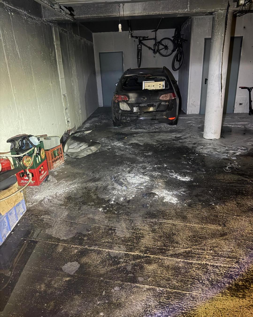 Das E-Fahrzeug wurde vollständig zerstört. Die Garage sowie ein zweites Fahrzeug, ein Verbrenner, wurden stark beschädigt.
