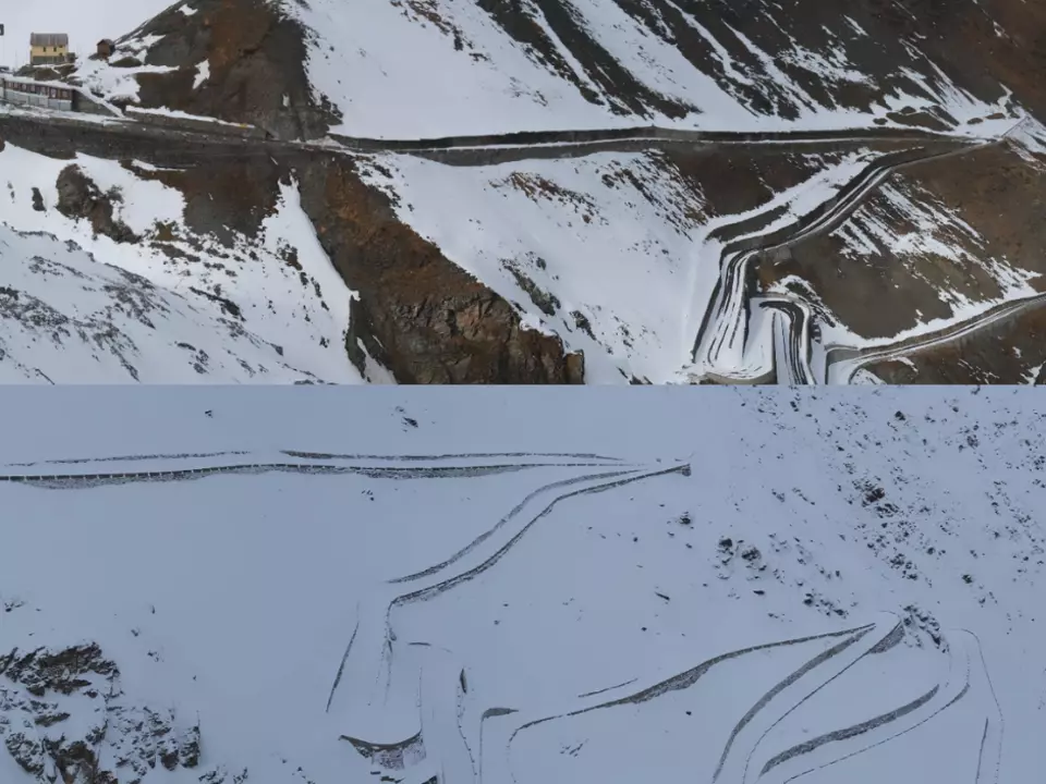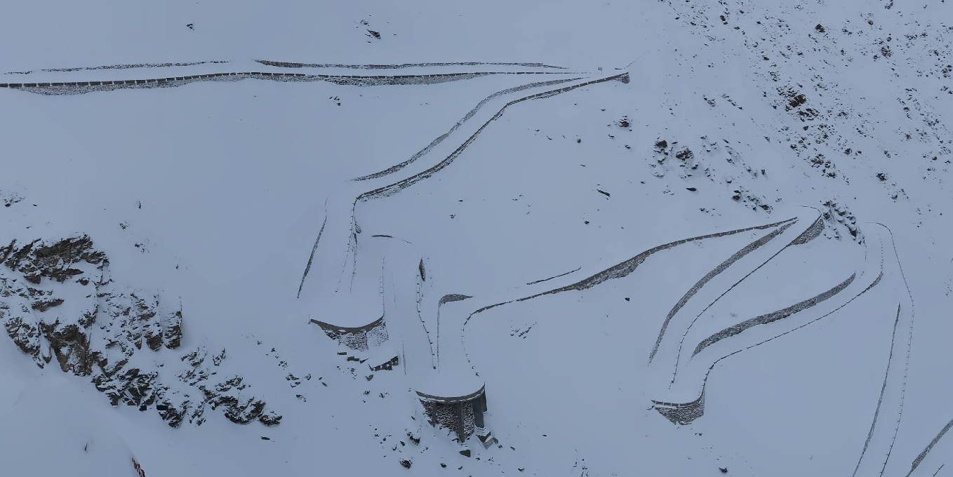 Nur zehn Tage später ist die Passstraße kaum wiederzuerkennen. Eine dicke Schneeschicht hat die Landschaft und die Straße auf über 2.000 Metern Meereshöhe in winterliche Ruhe gehüllt.
