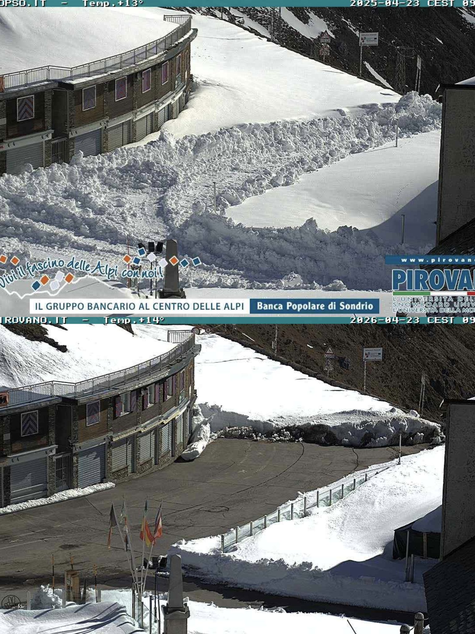 Stilfser Joch – Während im Tal schon längst der Frühling eingezogen ist, herrscht am Stilfser Joch auf über 2700 Metern Meereshöhe noch der Spätwinter. Im Vergleich mit April 2025 zeigt sich das Joch aber deutlich frühlingshafter.