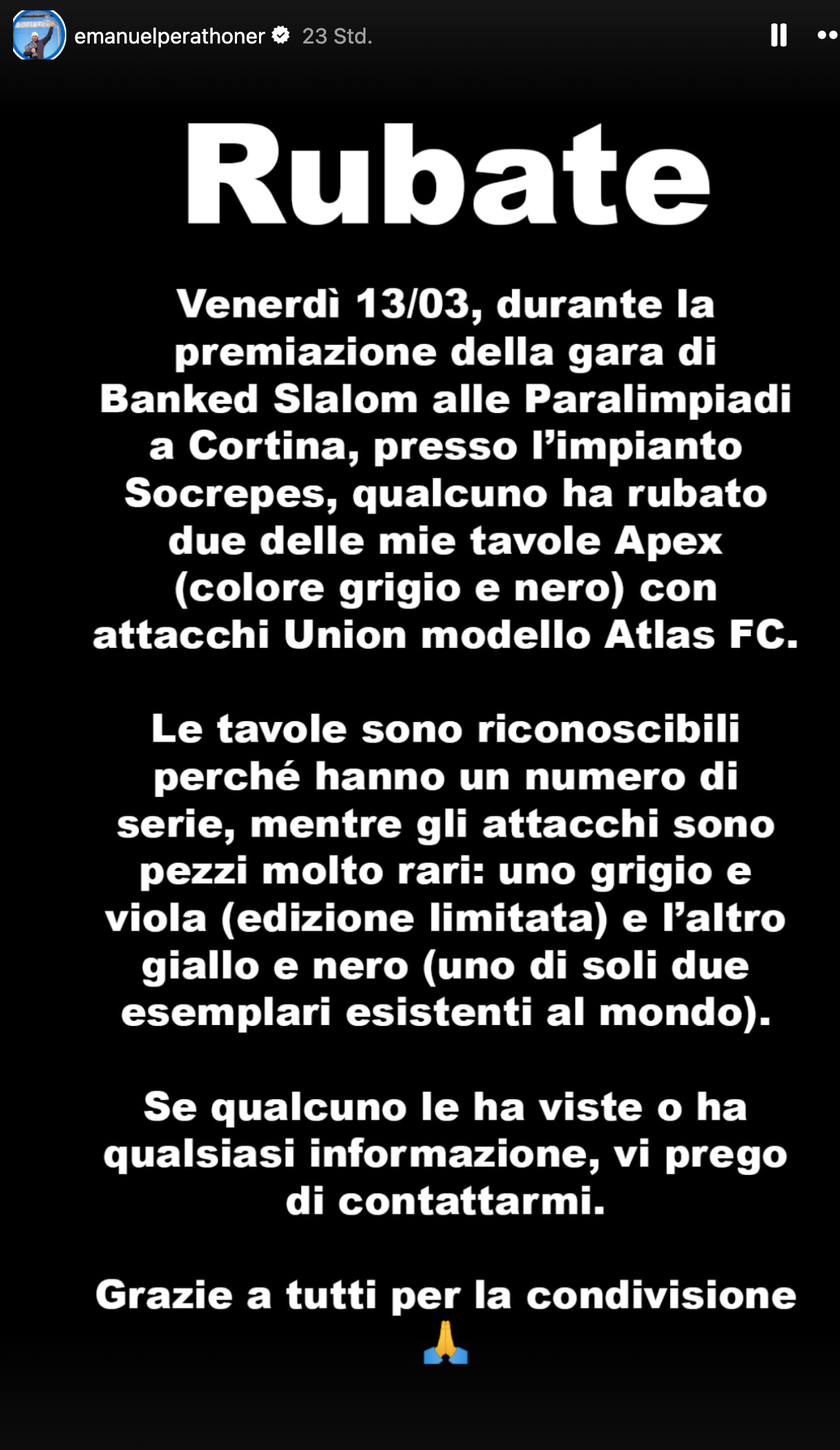 Perathoner, Jahrgang 1986, appellierte über die sozialen Medien an mögliche Zeugen, sich bei ihm zu melden. Der Südtiroler hatte bereits an den Paralympics in Paralympische Winterspiele 2010 und Paralympische Winterspiele 2018 teilgenommen und sich nach einem schweren Trainingsunfall 2021 eindrucksvoll zurückgekämpft.