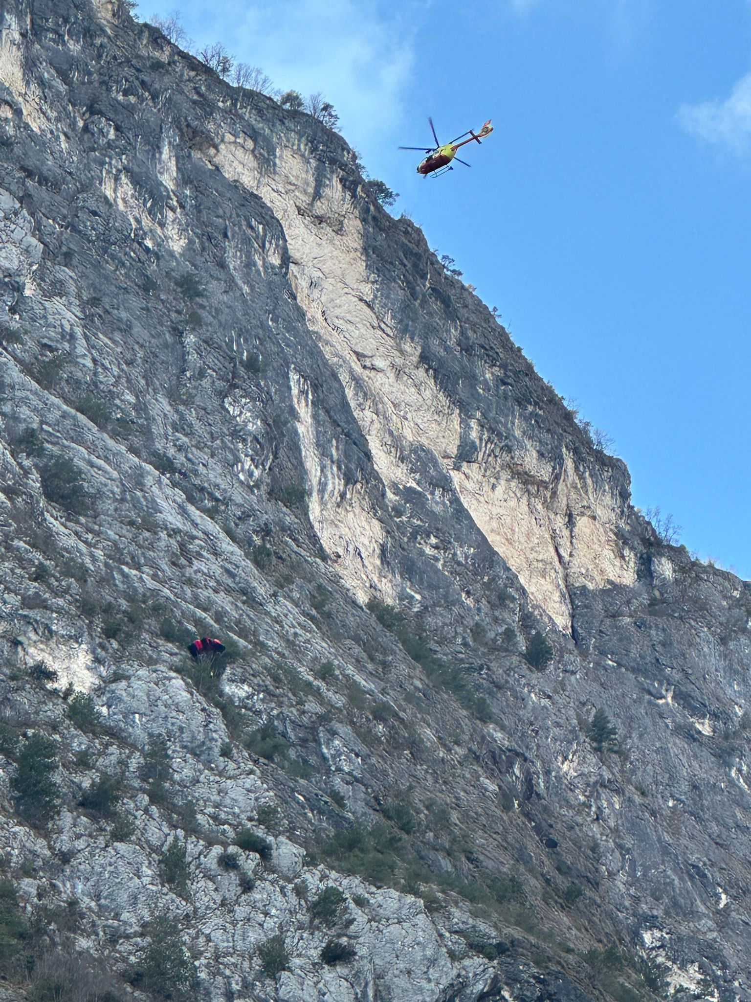 Während sich die Bergretter der Ortsgruppen Val di Ledro und Riva del Garda auf dem Landeplatz bereit machten, forderte die Notrufzentrale den Einsatz des Hubschraubers an. Als der Hubschrauber am Unfallort eintraf und den Gleitschirm aus der Luft gesichtet hatte, seilte die Besatzung den Rettungstechniker der Bergrettung mit einer Winde etwa 60 Meter weiter bergauf in sicherer Entfernung ab. So sollte verhindert werden, dass sich der Gleitschirm durch die Luftbewegung aufblähte und abstürzte. Der Retter richtete anschließend eine Verankerung ein und seilte sich zum Basejumper ab. Für ihn kam jedoch jede Hilfe zu spät. Der Arzt konnte nur noch seinen Tod feststellen.
