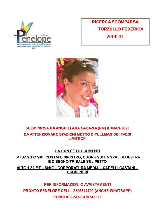 Auch der ehrenamtliche Vermisstenverein Penelope hat sich des Falls der 41-Jährigen angenommen und Alarm geschlagen. In der Vermisstenanzeige wird sie als 1,80 Meter groß mit langen braunen Haaren beschrieben. Die 41-Jährige hat mehrere Tätowierungen: Eine auf der linken Brustseite, ein Tribal-Motiv in der Mitte und ein Herz auf der rechten Schulter. Ihre Familie und ihre Freundinnen hoffen, dass Federica lebt. „Helft uns, sie zu finden!”, bitten sie über den Verein um zweckdienliche Hinweise.