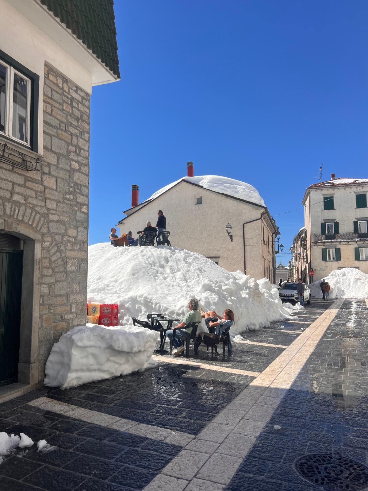 Das zeigt ein Foto im Netz. Die Bewohner nutzen die noch beachtlichen Schneehaufen im Ort als Terrassen für den Aperitif und ein kurzärmliges Sonnenbad.