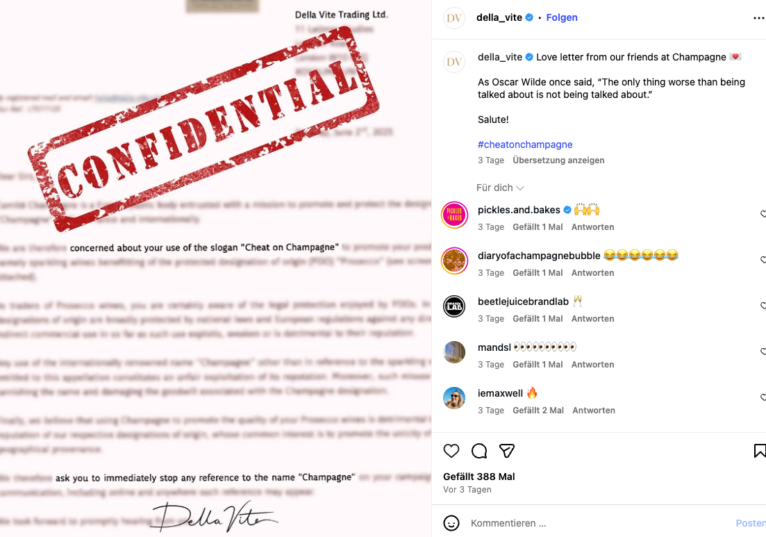 Anstatt der französischen Beschwerde nachzukommen, veröffentlichte “Della Vite” Teile des Schreibens auf Instagram, mit ironischem Unterton als “Liebesbrief unserer Freunde aus der Champagne”. Auch auf der Internetseite des Unternehmens steht weiterhin in großen Lettern “Cheat on Champagne” zu lesen.