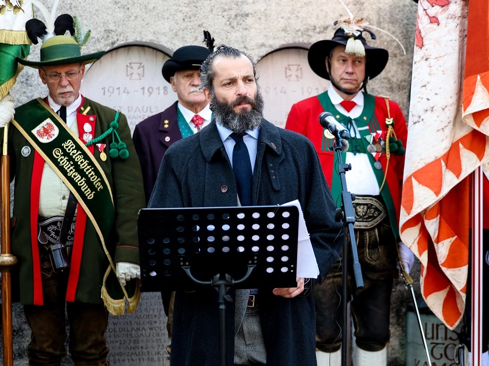 „Wir stehen heute hier im Gedenken an Menschen, die ihr Leben verloren haben, weil sie eine gerechte Zukunft für Tirol wollten. Ehre ihrem Andenken. Ehre für Tirol.“