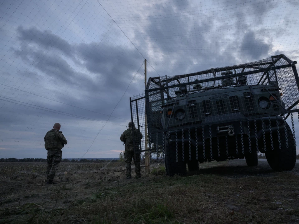 Ukrainische Soldaten schützen sich vor Drohnenangriffen