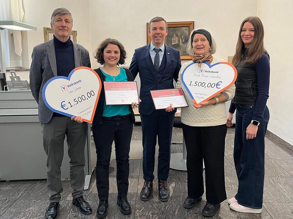 Bei einer kurzen Feier, die gestern Vormittag in der Volksbank-Zentrale am Kornplatz stattfand, erhielten die Gewinner des Solidaritätspreises 2025, Renata Pelizzoni Schwendtner und Sara Schena, den Scheck über 1.500 Euro, mit dem der Preis dotiert ist.