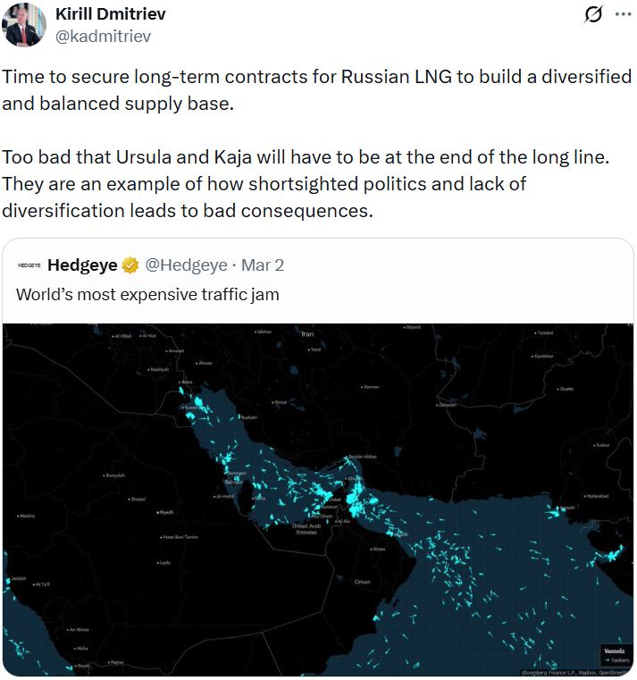 „Es ist an der Zeit, langfristige Verträge für russisches Flüssigerdgas abzuschließen, um eine diversifizierte und ausgewogene Versorgungsbasis aufzubauen.“ schrieb er. Sarkastisch fügte er mit einem Verweis auf die von den Spitzenpolitikern in Brüssel verfolgten Sanktionen hinzu: „Schade, dass Ursula (von der Leyen, Anm. d. Red.) und Kaja (Kallas, Anm. d. Red.) am Ende der Schlange stehen. Sie sind ein Beispiel dafür, welche negativen Folgen kurzsichtige Politik und mangelnde Diversifizierung haben können.“