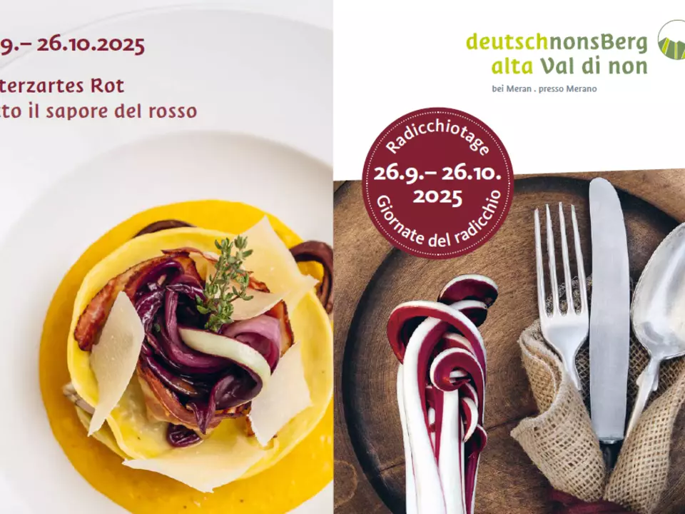„Das Highlight unserer Radicchiotage ist stets das Showcooking im Widumstadel in Unsere Liebe Frau im Walde, zu dem wir heuer Chef Alex Kaltenhauser, bekannt von seinem Projekt HEILSA, und unseren Stammgast Chef Maurizio Gallina eingeladen haben. Sie werden mit ihren kreativen Gerichten den Radicchio in Szene setzen,“ so Mirko Mocatti, Präsident des Tourismusvereins Deutschnonsberg. Seit vielen Jahren bieten die Radicchiotage im September und Oktober ein kulinarisches Herbst-Highlight an der deutsch-italienischen Sprachgrenze Südtirols zum Trentino. „Eine gute Gelegenheit, die schöne Landschaft hier zu erkunden, auf kulinarische Entdeckung zu gehen und diesen Kulturraum zu besuchen,“ erzählt Mirko Mocatti weiter. Heuer stehen außerdem ein Kochkurs mit Ingrid Mocatti im Restaurant Cervo, die Bilderausstellung „Katakombenschule“, die Buchvorstellung von Sabine Viktoria Kofler „Adolf Hitler entlarvt“ sowie jeden Freitag geführte Besuche durch den Gampenbunker mit anschließendem Radicchio-Aperitif auf dem Programm. Jeden Sonntag beim Genussmarkt im Dorfzentrum von Unsere Liebe Frau im Walde wird der frisch geerntete Winterradicchio mitsamt anderen lokalen Produkten zum Verkauf angeboten.