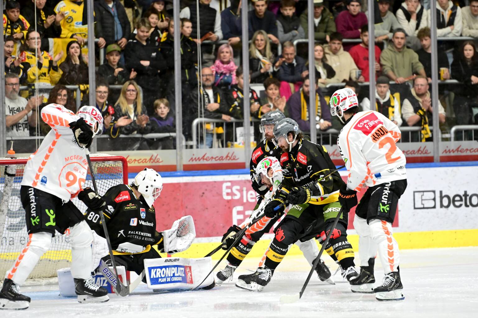 Die Hausherren starten stark in die Partie und „klopfen“ bereits in der 2. Minute bei einem Schuss von Purdeller an den Außenpfosten, das Tor machen jedoch kurz darauf die Grazer: nach einem verunglückten Befreiungsschlag kommt Kotkansalo mutterseelenalleine im Slot an die Scheibe und verwertet eiskalt zum 1:0 für die Gäste. Der HCP lässt sich dadurch jedoch nicht vom Gameplan abbringen und setzt den Kasten von Nicolas Wieser beinahe unter Dauerdruck. In der fünften Minute knallt ein satter Schuss von Rueschhoff ans Torgehäuse und auch im ersten Powerplay der Finalserie, welches der HCP souverän aufzieht, landet ein Schuss von Purdeller am Außenpfosten, während Ticar kurz darauf die Scheibe mit der Backhand nur knapp am Tor vorbeihebt. Auch Saracino lässt in den folgenden Minuten zwei Großchancen aus und in der 13. Minute haben die gut 3000 Schwarz-Gelben in der Arena bereits den Torschrei auf den Lippen, bei einer tollen Angriffskombination des HCP geht der Abschluss von Bardreau zwar durch die Beine von Wieser, springt jedoch vom Innenpfosten ins Feld zurück. Auch ein zweites Powerplay des HCP bringt nichts ein, weshalb das erste Drittel mit der glücklichen Gästeführung zu Ende geht.