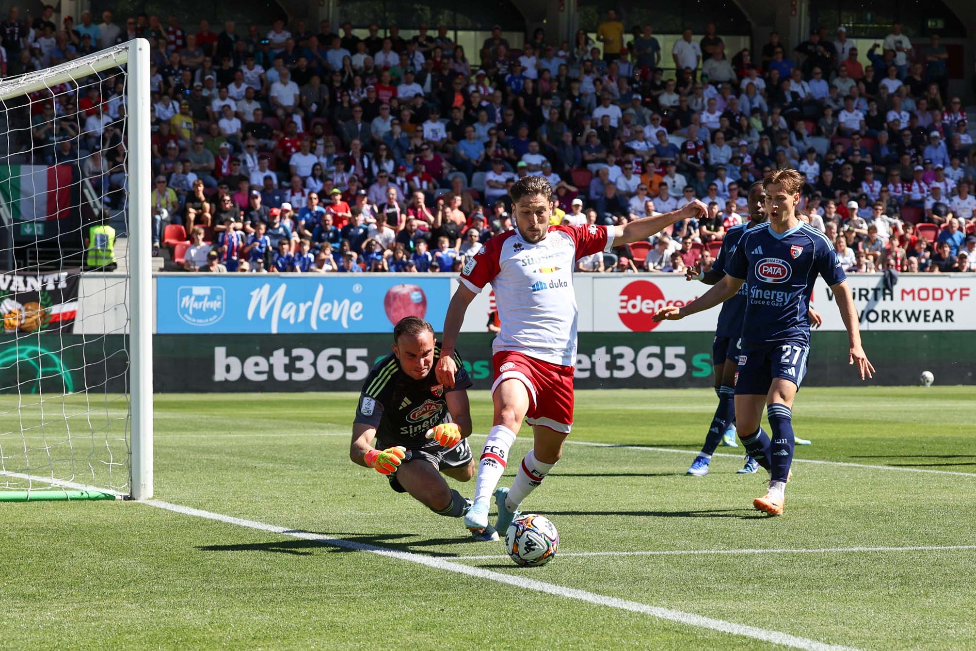 Im Rahmen des 36. und drittletzten Spieltags der Serie BKT 2025/26 kann sich Mantova im Bozner Drusus-Stadion im Duell der Tabellennachbarn mit 0:3 (0:2) durchsetzen. Den Anfang machen die Gäste dabei in der 35. Spielminute: Trimboli versenkt eine Ablage von Benaïssa per Direktabnahme sehenswert im rechten Kreuzeck zum 0:1. Kurz darauf das 0:2: nach Ablage von Castellini überwindet Marras Adamonis mit einem präzisen Linksschuss ins linke untere Eck (42.). Die Weißroten versuchen, nach dem Seitenwechsel zu reagieren – Tait scheitert nach Molina-Flanke von rechts per Kopf am linken Pfosten (58.) –, ehe Mantova in der Schlussphase alles klarmachen kann: Wieser fängt einen misslungenen Aufbauversuch von Adamonis ab, läuft auf den FCS-Schlussmann zu und überwindet diesen zum 0:3-Endstand (83.). In der Folge trifft Casiraghi noch per direktem Freistoß die Querlatte.