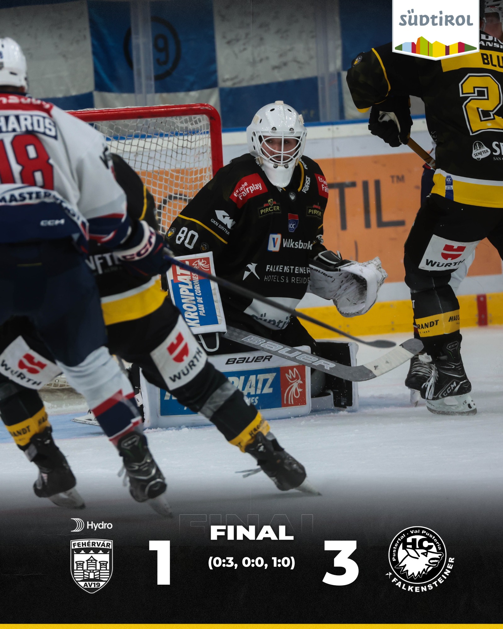 Die Wölfe feiern einen letztlich ungefährdeten 1:3-Auswärtssieg und holen sich auf ihrem Ost-Roadtrip die ersten drei Punkte. Bereits morgen um 17:30 Uhr wartet in Wien das nächste Duell gegen die Vienna Capitals – angefeuert von mehreren Hundert Pusterer Fans. Auf geht’s, Puschtra: kämpfen und siegen!