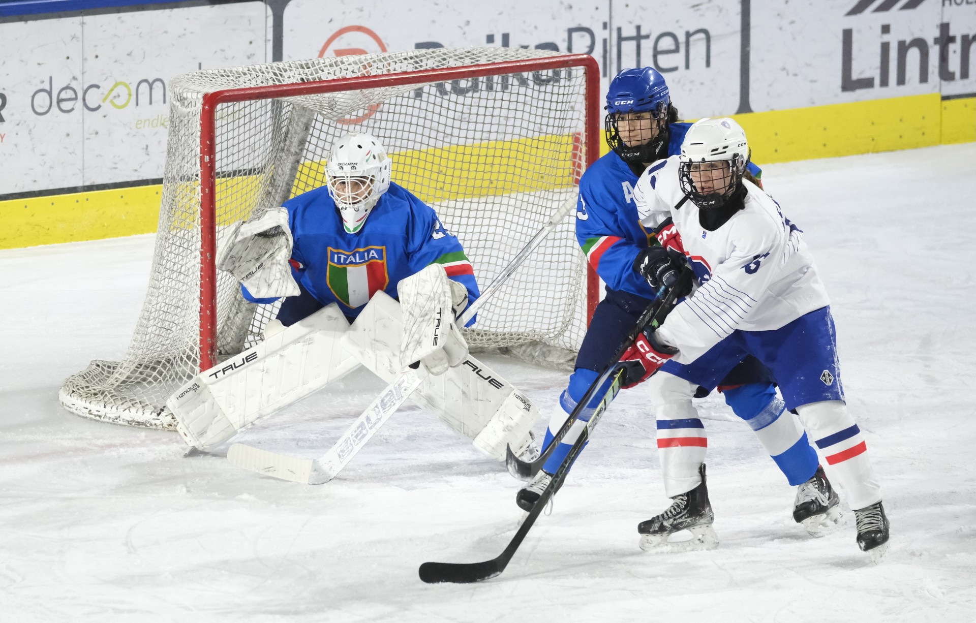 Gleich nach Wiederbeginn schwächte sich Italien aber selbst mit zwei Strafen binnen einer halben Sekunde. Frankreich ließ sich nicht zwei Mal bitten und erhöhte mit zwei Spielerinnen mehr auf dem Eis auf 3:1, wieder war Boudin die Torschützin (21.14). Insbesondere im Schlussdrittel drängte Italien auf das Comeback, aber Frankreich verteidigte sich kompakt und ließ keinen weiteren Treffer mehr zu. Damit hält Italien weiterhin bei null Punkten, während Frankreich auf den zweiten Platz hinter Japan steht.