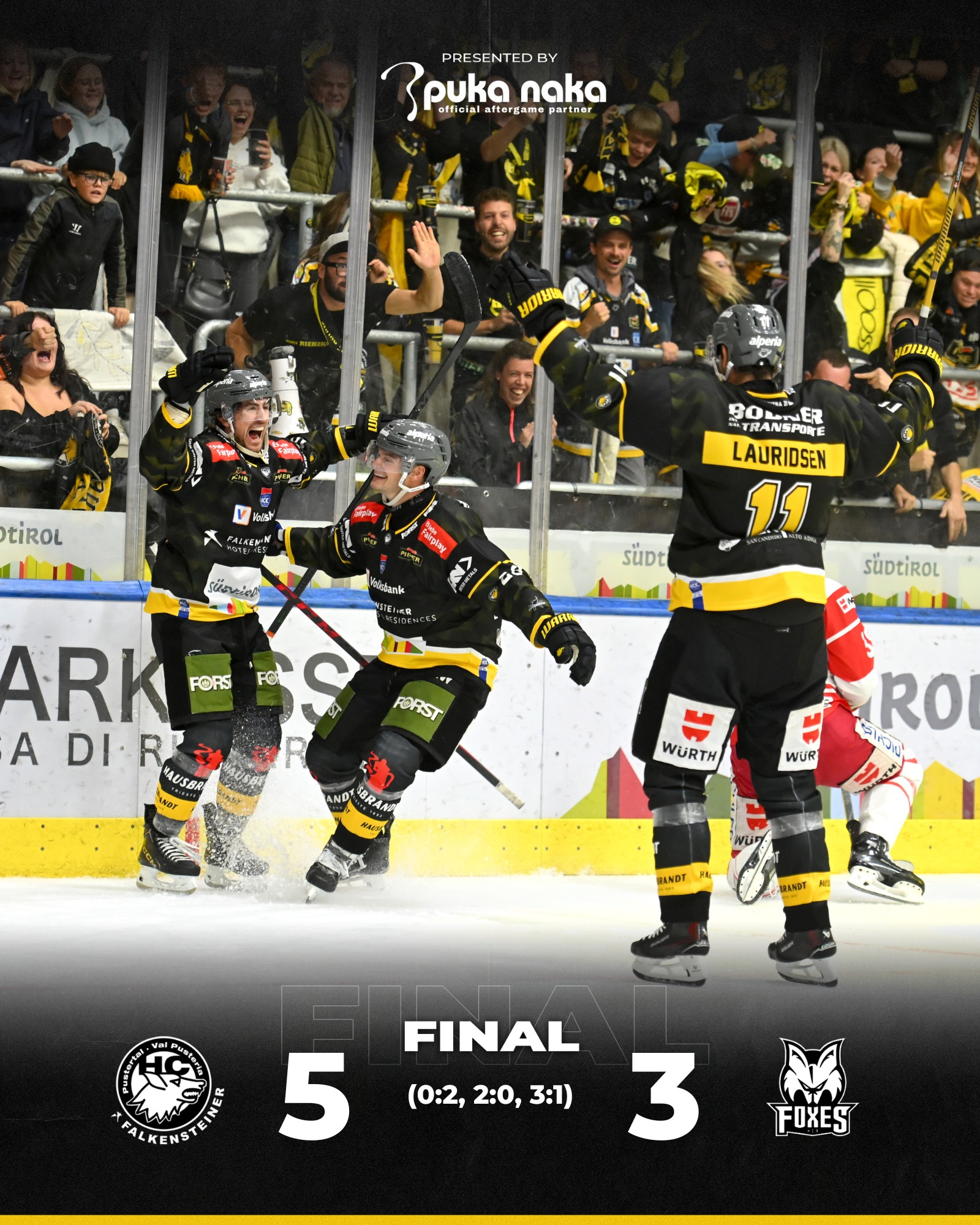 Bozen – Der erste Südtiroler Derby-Sieg der Saison geht an den HC Falkensteiner Pustertal. Der HCB Südtirol Alperia beendet seine Serie von sechs Siegen in Folge in der Intercable Arena, wo die Weiß-Roten mit 3:5 unterliegen. Bozen vergibt dabei eine Zwei-Tore-Führung aus dem ersten Drittel und später noch einmal eine erneute Führung im Mitteldrittel. Phasenweise wirkten die Foxes müde und unkonzentriert, während die Hausherren frischer und entschlossener auftraten. Am Sonntag steht in der Sparkasse Arena die Reaktion an – um 16:00 Uhr gegen den EC VSV (Family Day).