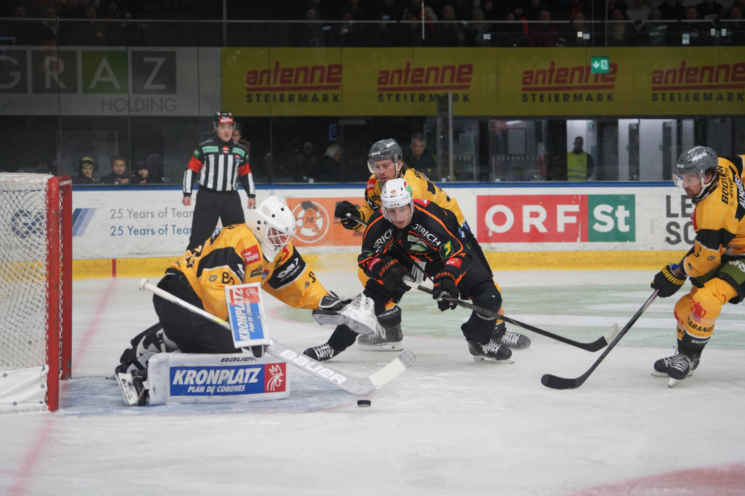 Das Startdrittel erfüllt die Erwartungen vollauf und die zahlreichen Zuschauer im Grazer „Bunker“ sehen ein temporeiches und attraktives Spiel. Die Grazer kommen gleich in der Startphase zu einem Powerplay und zeigen dort, dass sie nicht umsonst ganz vorne in dieser Statistik anzutreffen sind. Sie schnüren die Schwarz-Gelben fast zwei Minuten in ihrem Verteidigungsdrittel ein und schlagen kurz vor Ablauf der Strafe eiskalt zu: Pasquale ist bei einem Blueliner von Bailen gleich durch mehrere Spieler die Sicht verstellt und somit steht es bereits nach gut zwei Spielminuten 1:0 für die Hausherren. Der HCP hält jedoch mit geradlinigem Angriffsspiel dagegen und kommt bereits eine halbe Minute später nach einer Notbremse der Grazer zur großen Ausgleichschance, Bowlby beißt sich beim fälligen Penalty jedoch am starken Lagacé die Zähne aus. In der 11. Spielminute findet Bardreau die nächste gute Gelegenheit für die Gäste vor, er setzt einen Onetimer jedoch knapp am leeren Tor vorbei. Kurz darauf dann das nächste Überzahlspiel für die 99ers, aber diesmal killt der HCP die Strafe perfekt und kann bei einem seiner überfallartigen Gegenstöße sogar ausgleichen: Mantinger passt von der rechten Bande perfekt auf Lauridsen und dieser erzielt das verdiente 1:1. Zweieinhalb Minuten vor der zweiten Sirene gehen die Hausherren jedoch erneut in Führung, die Grazer sorgen erneut für sehr viel Verkehr vor Pasquale und so kann Zündel wieder per Blueliner auf 2:1 für die Hausherren erhöhen. Kurz vor der Pause noch eine brenzlige Situation beim dritten Powerplay für die Steirer, aber Pasquale verhindert mit einer Glanztat das dritte Tor für die Grazer.