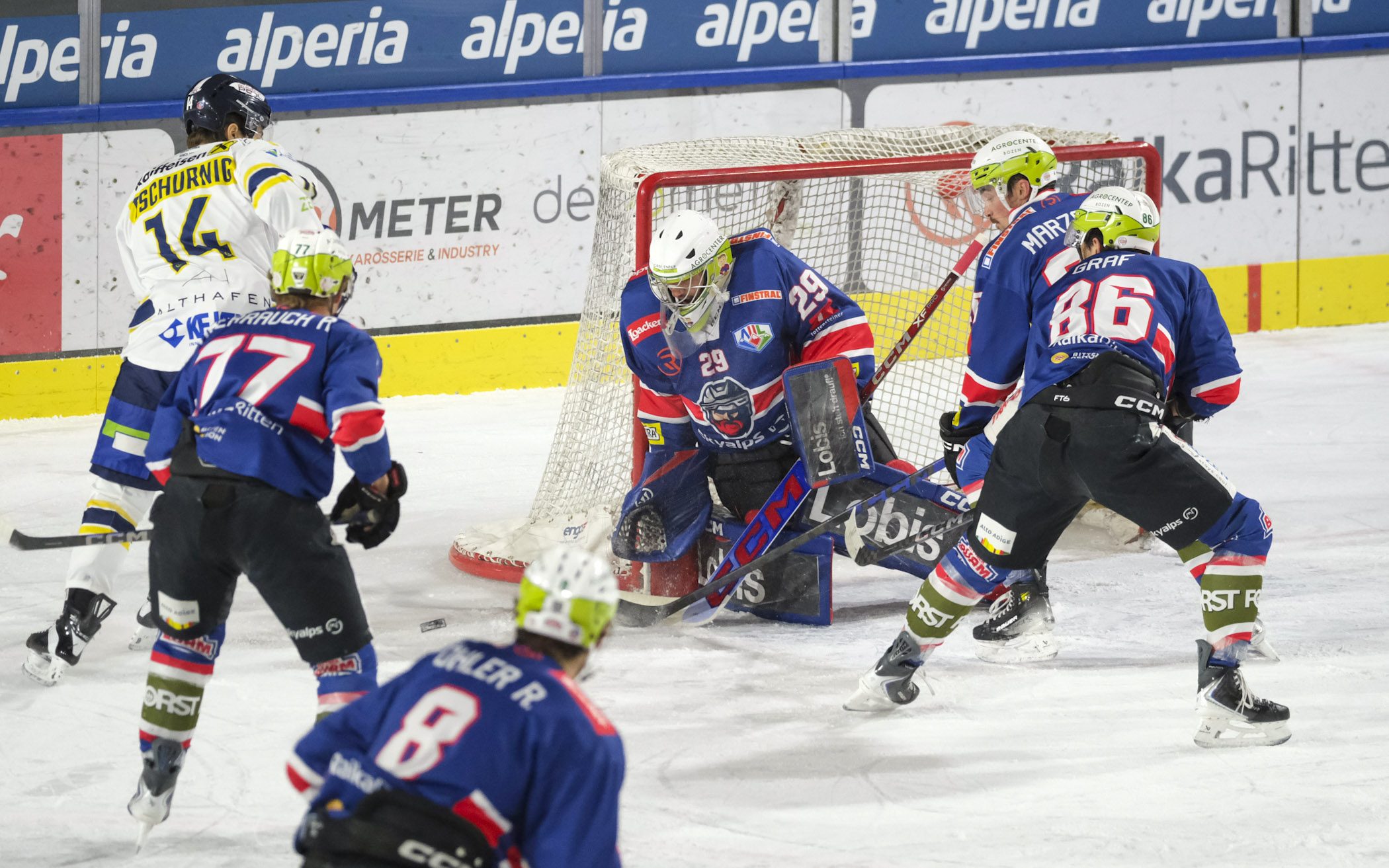 Nach der erfolgreichen Qualifikation für das Halbfinale der IHL Serie A am Donnerstag im Derby gegen HC Gherdëina galt es für die Rittner Buam SkyAlps, am Samstag nachzulegen, um in der Alps Hockey League den Anschluss an die Topplätze zu schaffen. Und das Spiel gegen den amtierenden Meister EK Die Zeller Eisbären versprach von Beginn an Spannung, denn es wurde in hohem Tempo agiert. Dabei blieben die Top-Chancen zunächst noch aus. Das änderte sich erst in den Powerplays, beide Mannschaften hatten je zwei davon im ersten Drittel. Auf der Seite der Rittner Buam vergaben Crespi (17.) und Alderson (18.) die besten Möglichkeiten, für Zell am See scheiterten hingegen Wilfan (12., knapp daneben) und Jennes (14./von Furlong gehalten). Damit blieb es nach den ersten 20 Spielminuten beim torlosen Zwischenstand von 0:0.