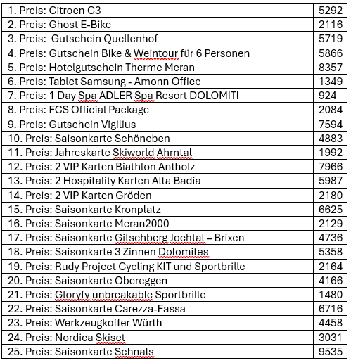 Die Gewinnerinnen und Gewinner können sich bei der Südtiroler Sporthilfe melden (suedtiroler@sporthilfe.it; 0471 975717). Die Preise müssen bis spätestens 27. Juli entgegengenommen werden.