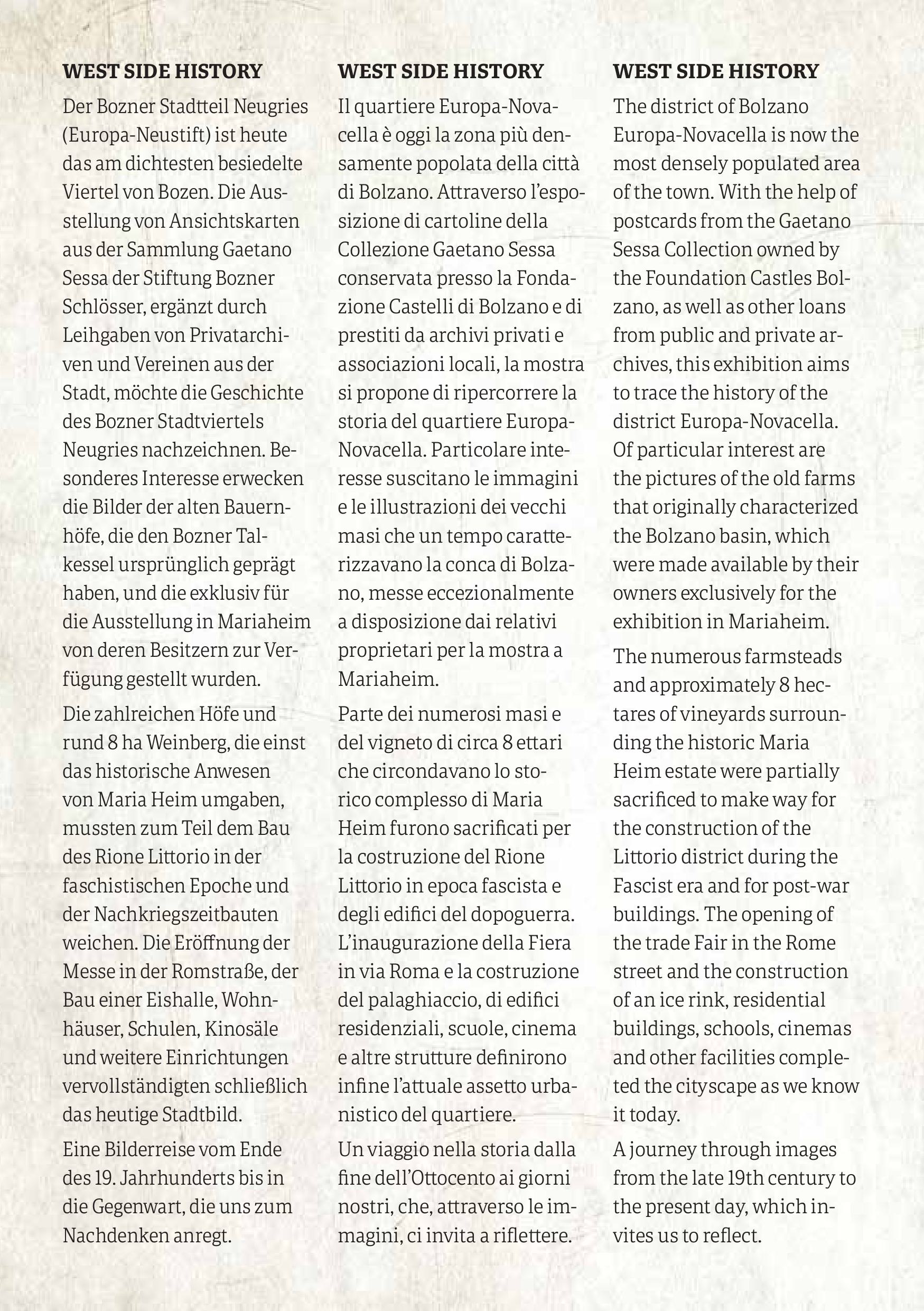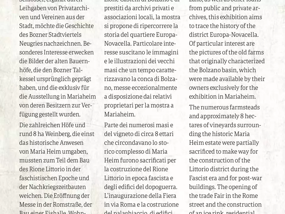 Gezeigt werden alte Post- und Ansichtskarten aus der Sammlung von Gaetano Sessa, die durch historische Fotografien aus privaten Archiven ergänzt werden. Ziel ist es, die Geschichte des Bozner Stadtviertels Neugries nachzuzeichnen. Ein besonderer Schwerpunkt liegt auf den ehemaligen Bauernhöfen, die das Viertel früher prägten. Viele der gezeigten Bilder wurden uns dafür exklusiv von den Eigentümer:innen der Bauernhöfe oder deren Nachkommen zur Verfügung gestellt.