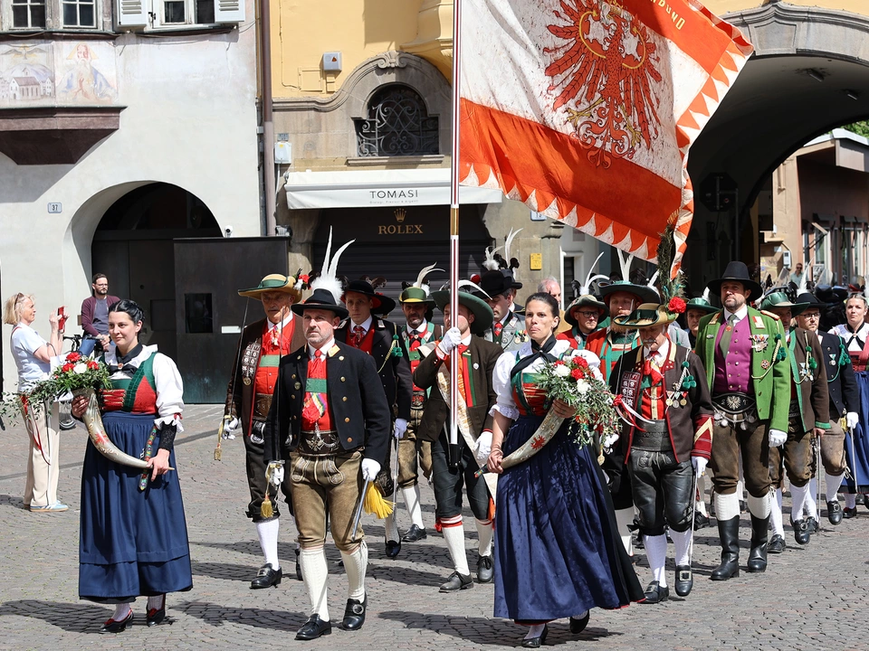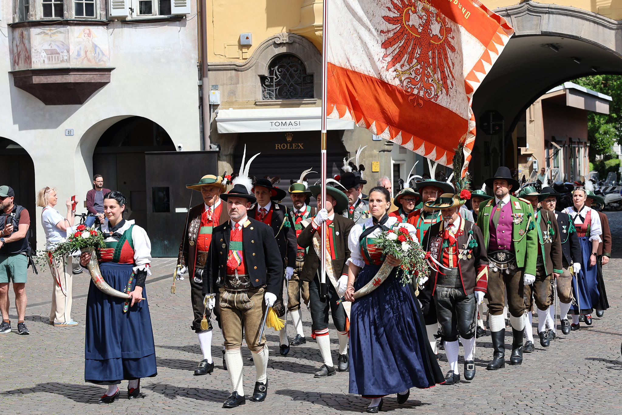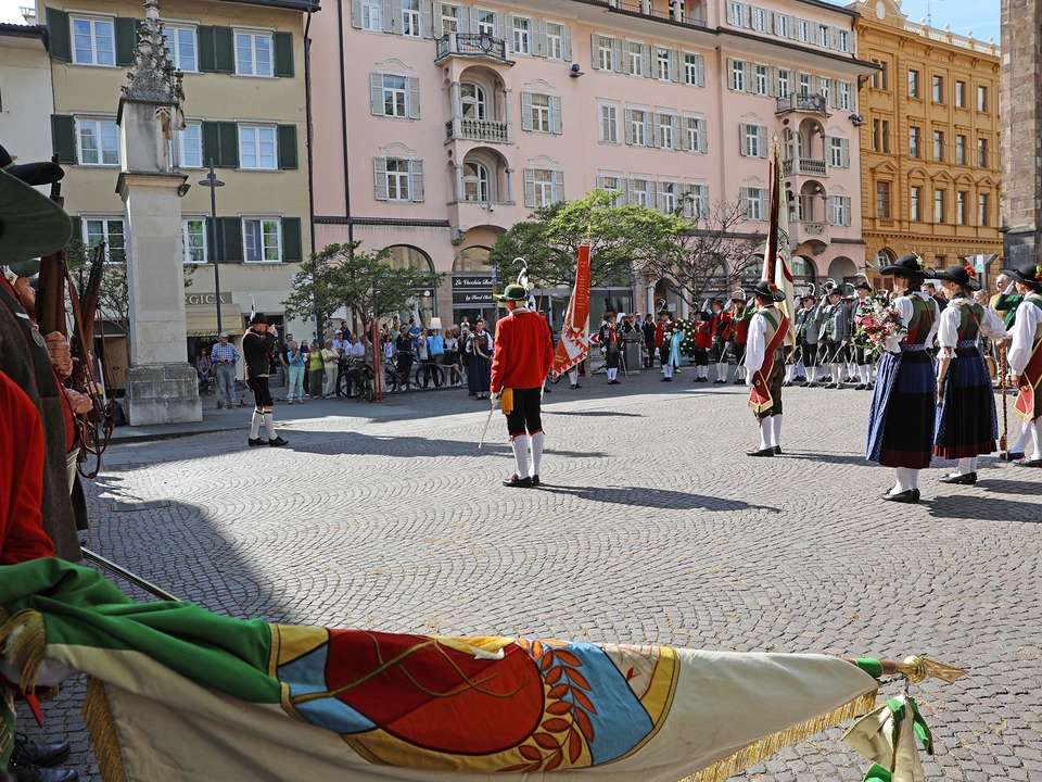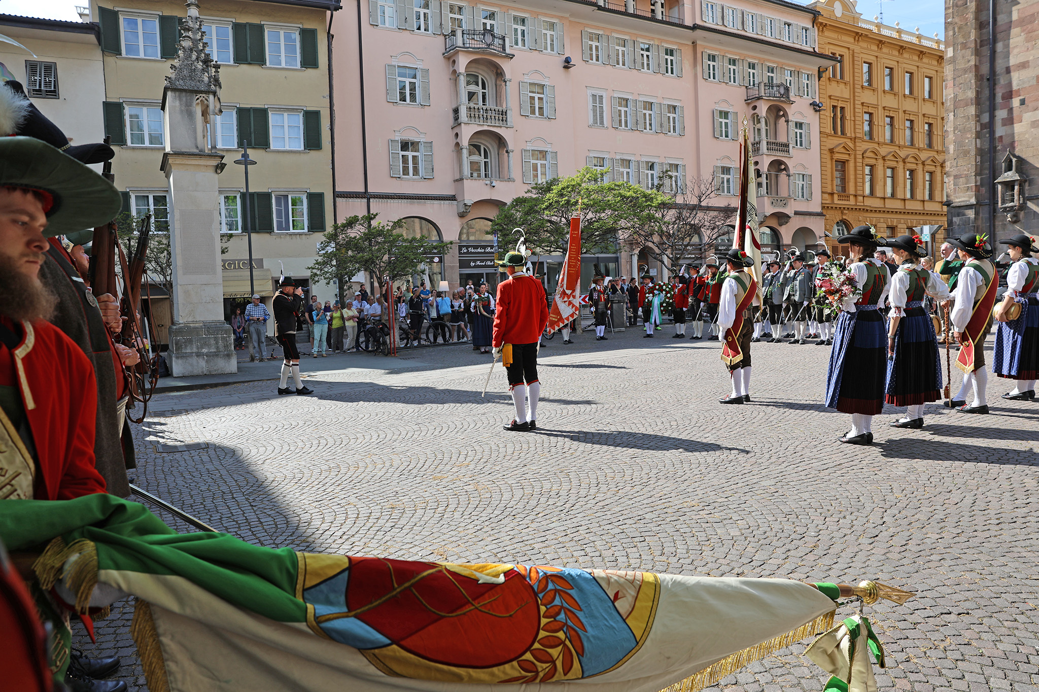 Bereits der Auftakt der Bundesversammlung war würdig und feierlich: Im Bozner Dom wurde ein Gottesdienst mit Landeskurat Pater Christoph Waldner OT gefeiert, musikalisch umrahmt von der Musikkapelle Mareit. Anschließend wurde am Peter-Mayr-Denkmal ein Kranz zum Gedenken an die verstorbenen Schützenkameraden und Marketenderinnen niedergelegt. Die Ehrenformation des Schützenbezirks Südliches Wipptal erwies den Verstorbenen mit einer Ehrensalve die letzte Ehre.