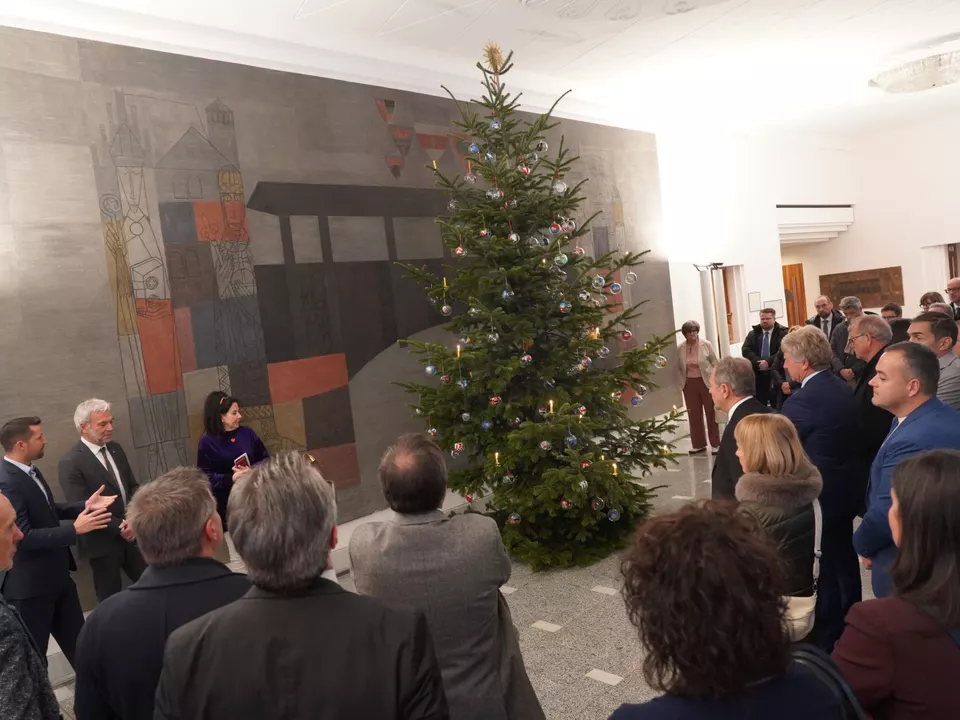 Anlass für das Treffen von Landtagspräsidium – neben Schuler waren auch Landtagsvizepräsident Angelo Gennaccaro und die Präsidialsekretär Franz Locher, Maria Elisabeth Rieder und Harald Stauder anwesend – mit Bürgermeistern war die Präsentation des Christbaums im Foyer des Landtagsgebäudes. Dieser Baum ist heuer erstmals mit 116 handbemalten Glaskugeln geschmückt, von denen jede einzelne das Wappen einer Südtiroler Gemeinde trägt. „Der Christbaumschmuck zeigt den Wert und die Bedeutung der Gemeinde im Land auf“, betonte Oberstaller die Bedeutung der Initiative für die Gemeinde. „Die Tatsache, dass die Christbaumkugeln alle gleich groß sind, symbolisiert zudem die Gleichwertigkeit der Gemeinden.“