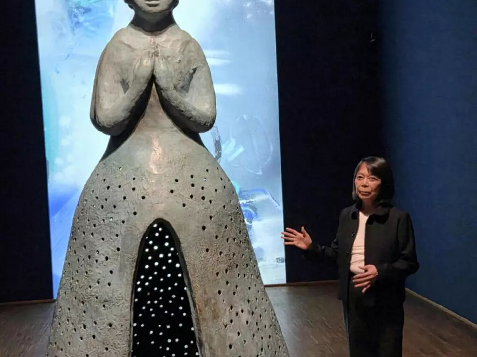 “Motherscape” versteht sich als Bilderwelt, “bevölkert auch von skulpturalen Elementen, die in den Raum hineingehen” (Gleis), die Verbindung asiatischer und westlicher Kultur wird sichtbar. Man darf über humorvolle Darstellungen auch lachen, so wie die Künstlerin und Gleis bei der Sichtung für die Auswahl. Ernsthaft ist die Stimmung am Ende: Aus Betroffenheit über das Erdbeben und die Nuklearkatastrophe von Fukushima schuf Ikemura die riesige Skulptur “Usagi Kannon Janus”, in der sie die Gestalt eines Hasen mit Kannon, dem weiblichen Bodhisattva des Mitgefühls verbindet – platziert vor einer Dreikanal-Videoinstallation.