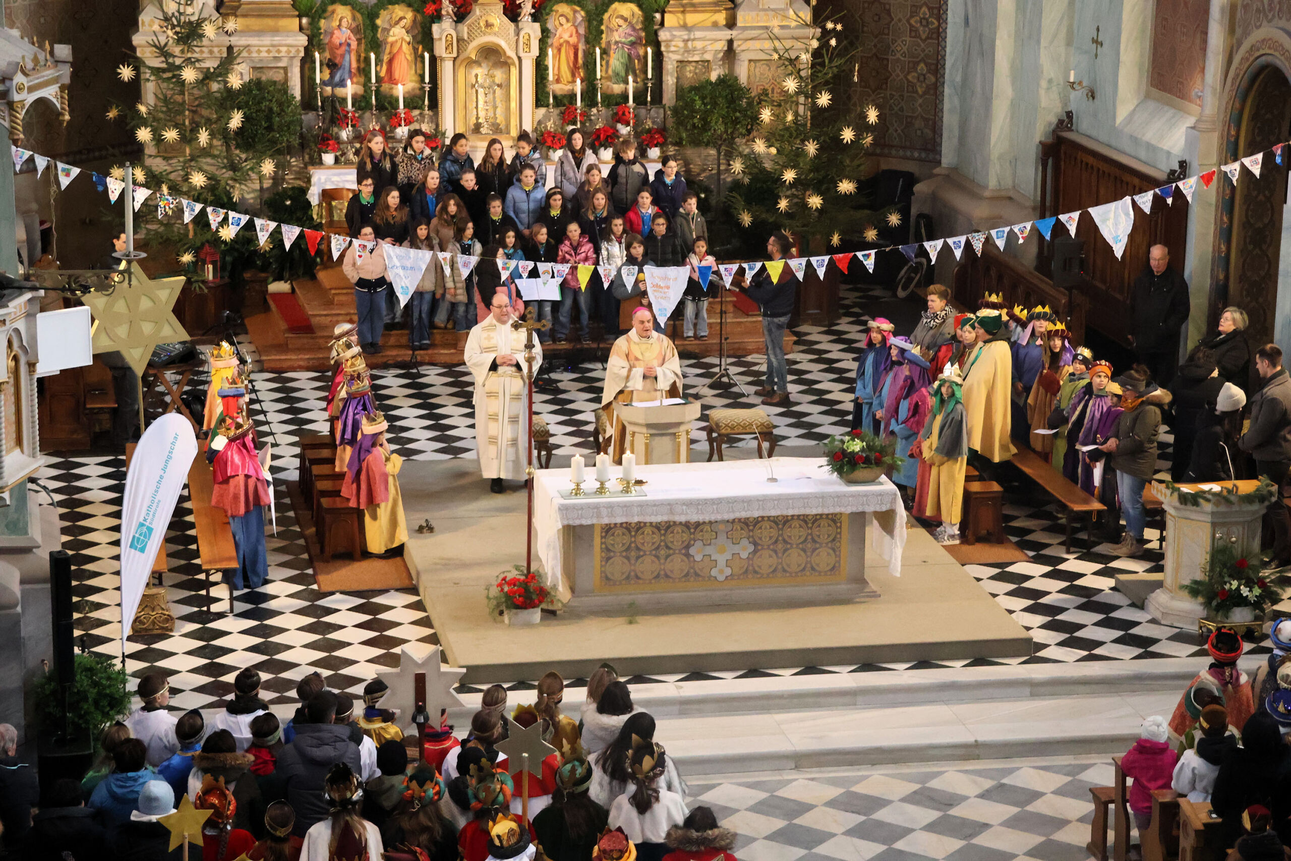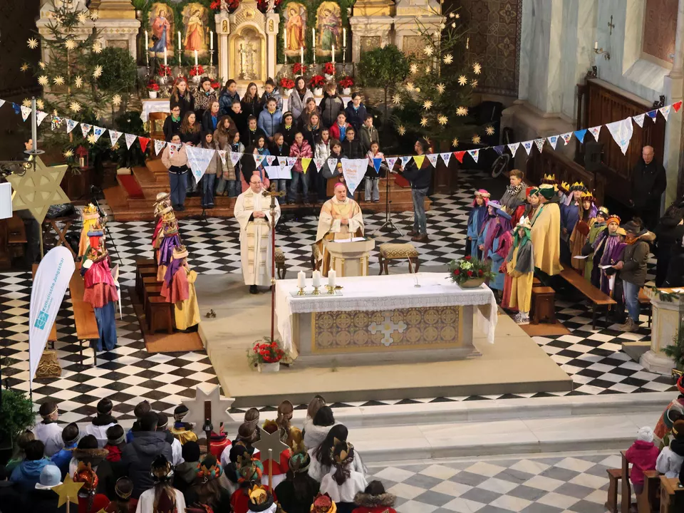 Nach dem Umzug feierten die Sternsinger:innen in der Pfarrkirche von Bruneck eine feierliche Messe mit Bischof Ivo Muser, Bischofssekretär Michael Horrer und Dekan Josef Knapp. Musikalisch begleitet wurde der Gottesdienst vom Minichor Bruneck. Die Messe stand ganz im Zeichen des Friedens, der sowohl das Jahresthema der Jungschar als auch eine zentrale Botschaft der Sternsinger:innen ist. Bischof Ivo Muser hob in seiner Predigt die Wichtigkeit des Sternsingens hervor: “Durch das Sternsingen wurde wieder eine Spur des Segens, des Gotteslobes und der Menschlichkeit durch unsere Diözese gelegt. Eine Spur des Glaubens, der Hoffnung und der Solidarität, die viele Menschen miteinander verbindet – bei uns und weltweit. Tausende Kinder und Jugendliche waren in Südtirol für die Aktion Sternsingen unterwegs. Ihnen allen sage ich ein großes Danke. Mein Dank gilt aber auch allen, die sie vorbereitet und begleitet haben. Danke an alle, die sie aufgenommen und die ihnen ihre Spende übergeben haben.”