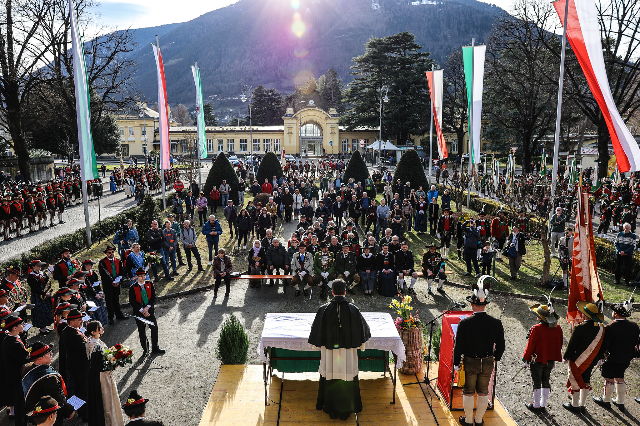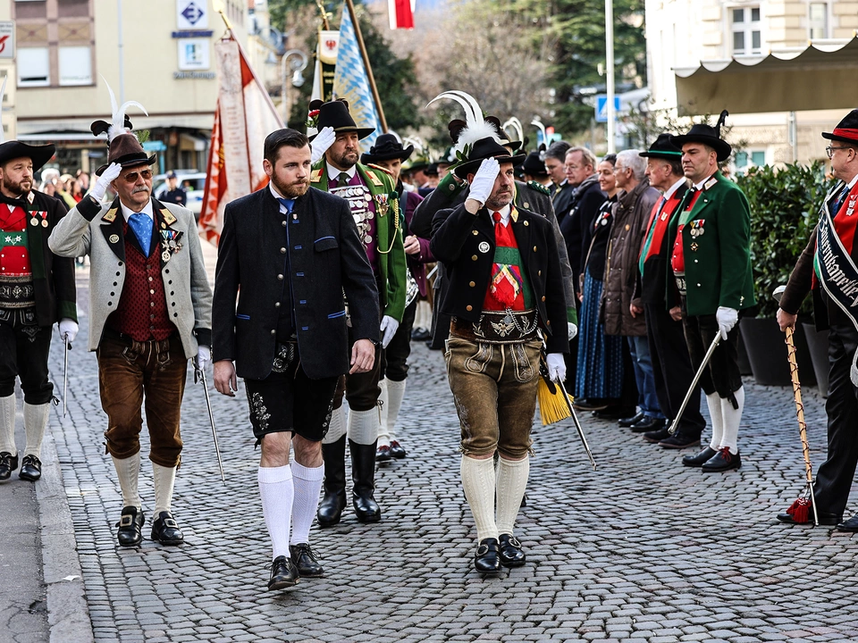 Nach der Aufstellung der Schützenkompanien, Abordnungen und Ehrengäste sowie der Bauernkapelle Völlan in der Freiheitsstraße erfolgten die Frontabschreitung und der feierliche Abmarsch durch die würdevollen Meraner Gassen zum Andreas-Hofer-Denkmal im Bahnhofspark.