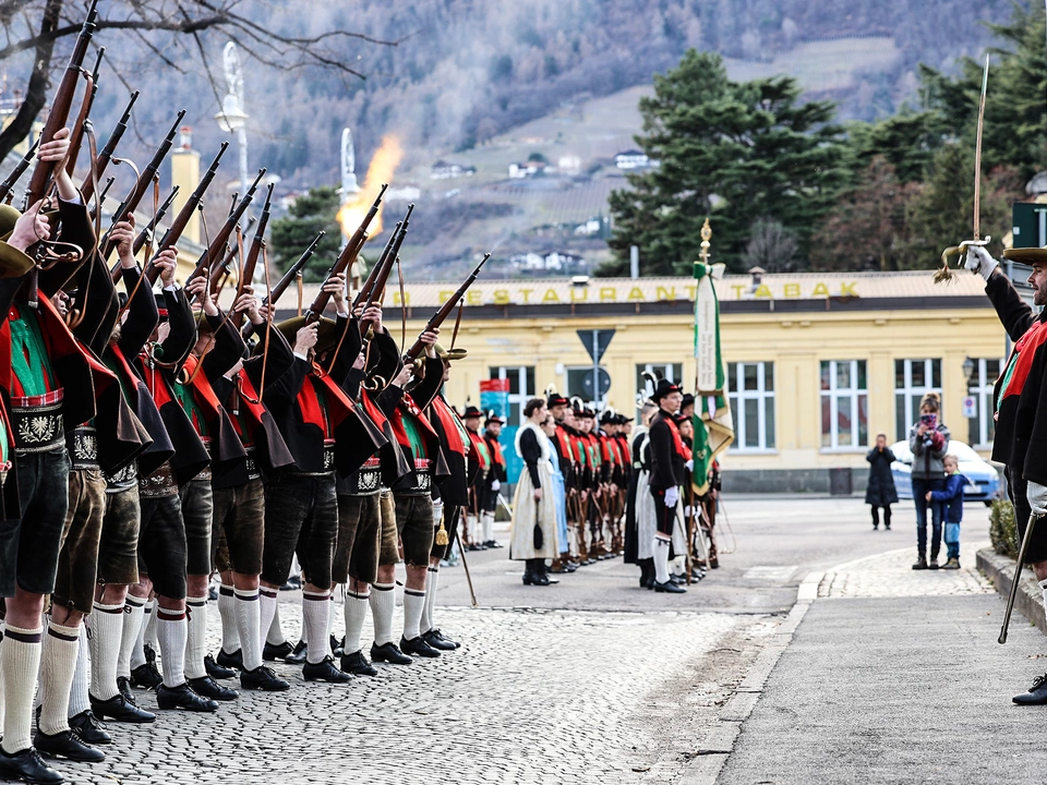 Die Schützenkompanie Meran feuerte die Ehrensalve ab, ehe die Tiroler Landeshymne erklang und die Kränze niedergelegt wurden. Damit erwiesen die anwesenden Schützen Andreas Hofer und seinen Mitstreitern die höchste Ehrerweisung.