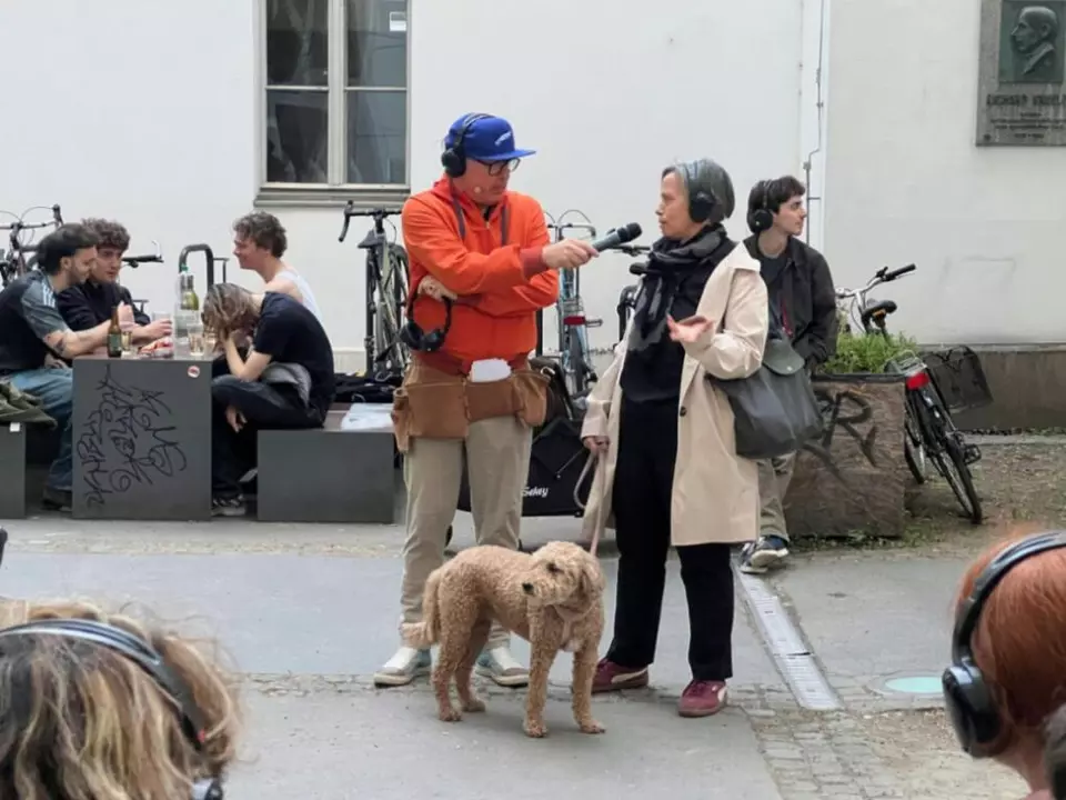 Die Mischung aus Live-Feldforschung, Performance und Situationskomik machen die “Guerillawalks” zu einem interaktiven Erlebnis. “Bei meinen künstlerischen Arbeiten ist es mir wichtig, dass das Publikum nicht nur konsumiert, sondern aktiv teilnimmt”, sagt Hangl. Die Teilnehmenden werden von Beginn an eingebunden, etwa beim Tragen des Equipments. Der Walk beginnt am Karlsplatz und lebt von spontanen Begegnungen. Hangl fragt zufällige Passanten nach ihrer Meinung zum ESC: “Das Phänomen Songcontest ist einzigartig! Ich würde sagen, der ist mit dem Superbowl in einer Kategorie”, meint ein Befragter. Eine Gruppe junger Frauen sitzt lernend in einem Café am Karlsplatz, Hangl fragt sie, ob Wien schon im Ausnahmezustand sei: “Man kriegt noch nicht so viel mit in der Stadt”, sagt eine der Befragten. “Noch nicht!” ergänzt ihre Freundin.