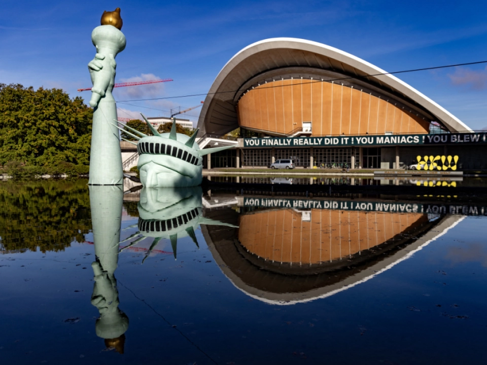 In der Ausstellung waren Hass-Parolen auf Postkarten und Exponate zwischen echtem Leben und Medienwirklichkeit zu sehen. Vor dem Haus der Kulturen der Welt ragten von der Freiheitsstatue nur noch Kopf und Arm aus einem Wasserbecken. Darüber prangen auf Englisch die Sätze: “Ihr habt es endlich geschafft! Ihr Verrückten! Ihr habt es vermasselt!” Die Anspielung auf die Schlussszene des Filmklassikers “Planet der Affen” (1968) nach dem Untergang der Menschheit empfing die Besucher des Projekts.