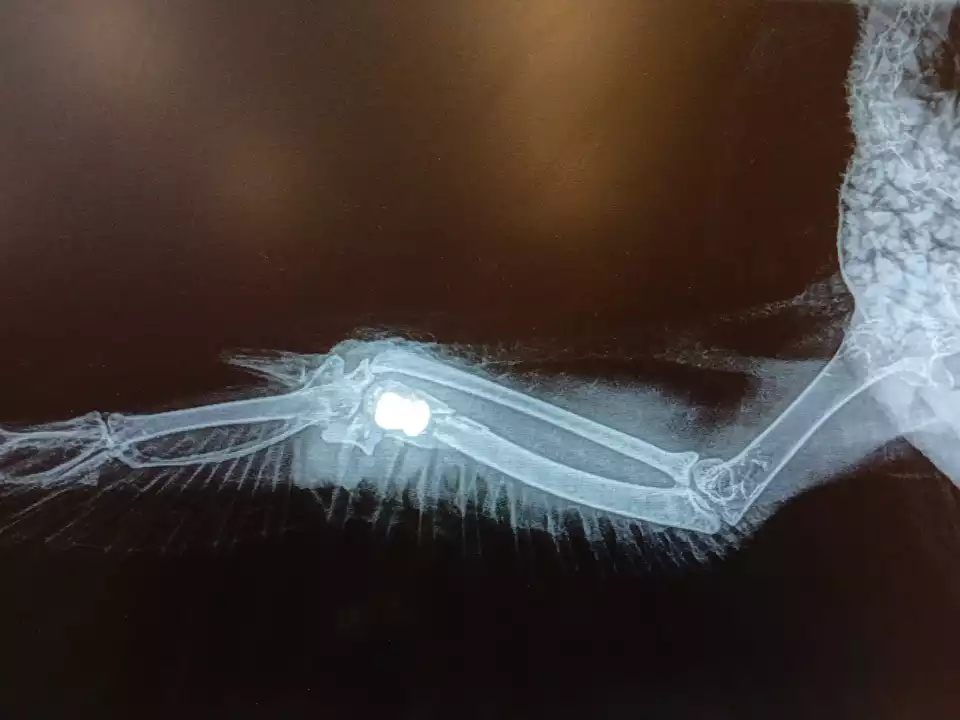 Bei klinischen und radiologischen Untersuchungen stellten die Fachleute einen Bruch des Flügels in der Nähe des Karpalgelenks fest. Zusätzlich wurde ein Metallkörper im Gewebe entdeckt, der operativ entfernt werden konnte. Der Gesundheitszustand des Tieres wird als sehr ernst eingeschätzt. Aufgrund der Lage des Bruchs sowie des erhöhten Infektionsrisikos ist die Prognose laut Tierklinik derzeit zurückhaltend.