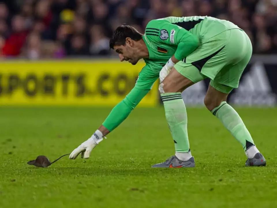 Thibaut Courtois versucht vergeblich, das Nagetier zu fangen