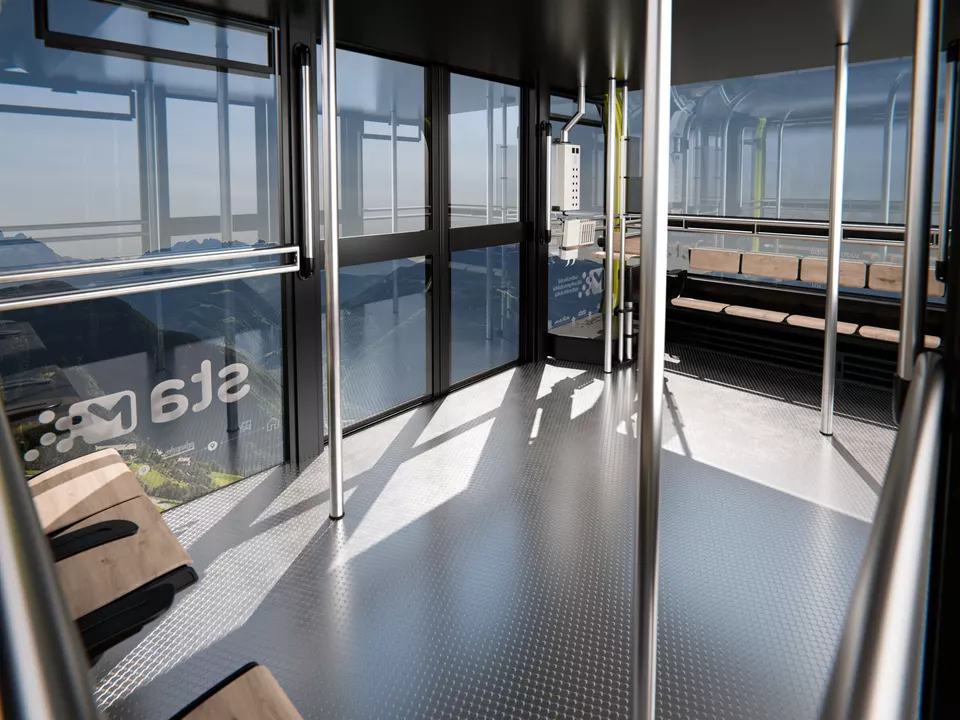 Auch bei den Kabinen setzt das Projekt neue Akzente. Geplant sind Panoramakabinen mit über 80 Prozent Verglasungsanteil in neuem Design. Eine programmierbare Verdunkelung mittels Polarisierung ermöglicht es, die Transparenz der Verglasung situativ anzupassen: Beim Überfahren von Wohngebieten wird die Verglasung automatisch undurchsichtig geschaltet, um Einblicke in private Bereiche zu verhindern. Nach dem Überflug wird sie wieder transparent. Die Kabinen sind modular ausgelegt und können je nach Bedarf vom reinen Personentransport auf kombinierte Nutzung – etwa mit Fahrrädern – angepasst werden.