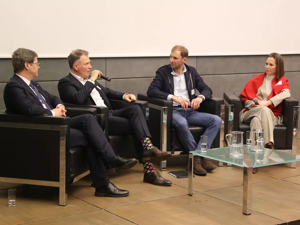 Ein weiteres Highlight des Events bildete eine Podiumsdiskussion, an der neben Christian Mandl noch folgende Vertreterinnen und Vertreter der Südtiroler Wirtschaft teilnahmen: Stefan Rainer, Verkaufsleiter der Oberalp AG; Andreas Rogger, Personalverantwortlicher der Firma Alpitronic; Karoline Walch, Geschäftsführerin des Weinguts Elena Walch. Sie beleuchteten das Thema aus verschiedenen Perspektiven, mit besonderem Fokus auf das Exportgeschäft und die Vor- und Nachteile global integrierter Wertschöpfungsketten. Abschließend nutzte das Publikum die Gelegenheit für vertiefende Fragen und Anmerkungen.