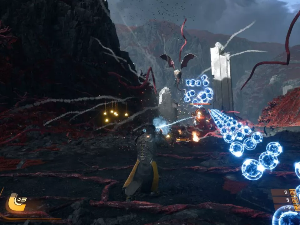 An bestimmten Punkten eines Bioms bricht die Finsternis über den Planeten herein. Carcosas Blau- und Grautöne verwandeln sich während eines solchen Zyklus in höllisches Rot. Alles verändert sich: Tentakel wachsen aus dem Fels, Gegner schlagen härter zu, Projektile passieren auf einmal problemlos den Schild.