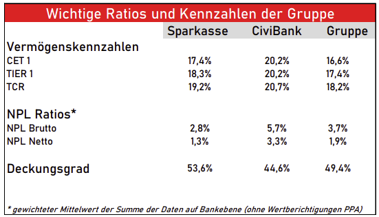 Die Vermögenskennzahlen der zwei Banken und der Gruppe profitieren von den positiven Auswirkungen der eingeführten Vorschriften „Basel IV“, der erstmals angewandten internen Modellen IRB sowie vom hohen Gewinnanteil 2025, der Rücklagen zugeführt wird, bereinigt von den Auswirkungen auf das Vermögen durch die Freistellung der Rücklage der Übergewinne. Die harte Kernkapitalquote (CET 1 Ratio) beläuft sich auf 16,6 Prozent im Vergleich zu 14,7 Prozent im Vorjahr, während die Gesamtkapitalquote (Total Capital Ratio) auf 18,2 Prozent gegenüber 16,0 Prozent im Vorjahr gestiegen ist. Auf Gruppenebene liegen die NPL-Ratios bei Werten, mit welchen die Gruppe Sparkasse zu den Kreditinstituten mit dem niedrigsten Niveau an Problemkrediten zählt: Brutto-Wert 3,7 Prozent und Netto 1,9 Prozent (Summe der individuellen Werte der zwei Banken der Gruppe). Der Deckungsgrad für Problemkredite beläuft sich auf 49,4 Prozent.