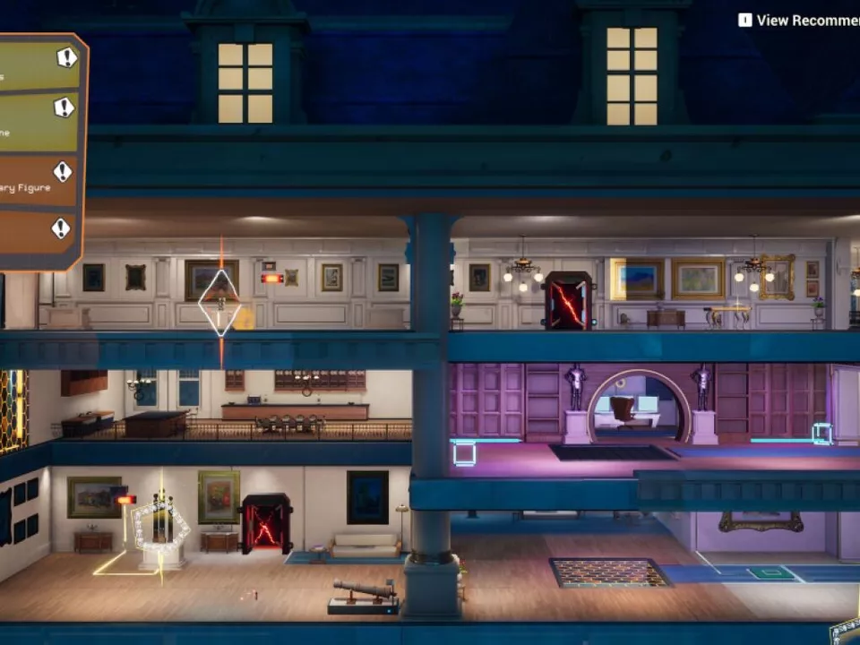Diese Infos bekommt man in der ersten Phase der Missionen, der Teambesprechung. Dann geht es über in die Planungsphase: Das Spiel ist zunächst ein 2D-Sidescroller. Zunächst müssen die Routen durch die Gebäude geplant werden – zunächst zum Artefakt hin, dann der Fluchtweg aus dem Gebäude heraus. In dieser Phase ist das Game wie ein Puzzle: Schalter müssen belegt und Türen mit Tischen offengehalten werden, damit der Rückzug glückt.