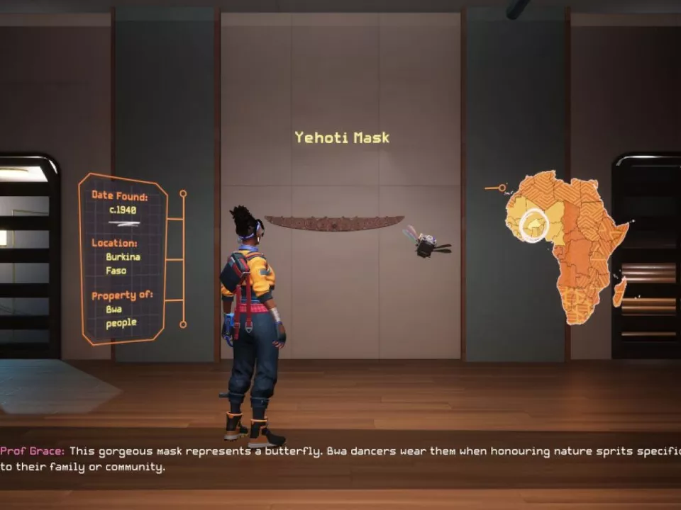 Zeitlich ist das Spiel in der nahen Zukunft angesiedelt. Die Spielwelt ist optisch – sagen wir – afrofuturistisch gehalten: Mit Hologrammen und Kraftfeldern, aber auch mit traditionellen Mustern und Materialien. Darin bewegt sich Nomali, eine Parkour-Künstlerin. Sie wird von ihrer Großmutter angeworben, um all jene versteckten historischen Stücke aus Museen und privaten Kollektionen zurück auf den afrikanischen Kontinent zu bringen, die nicht Teil der offiziellen Raubkunst-Rückführungen sind.